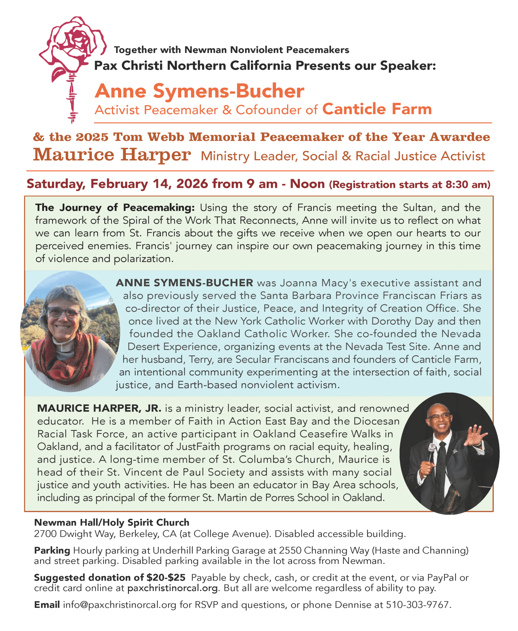 Together with Newman Nonviolent Peacemakers, Pax Christi Northern California Presents our Speaker: Anne Symens-Bucher, Activist Peacemaker & Cofounder of Canticle Farm and the 2025 Tom Webb Memorial Peacemaker of the Year Awardee Maurice Harper, Ministry Leader, Social Racial Justice Activist, on Saturday, February 14, 2026 from 9:00 a.m. – 12:00 p.m.